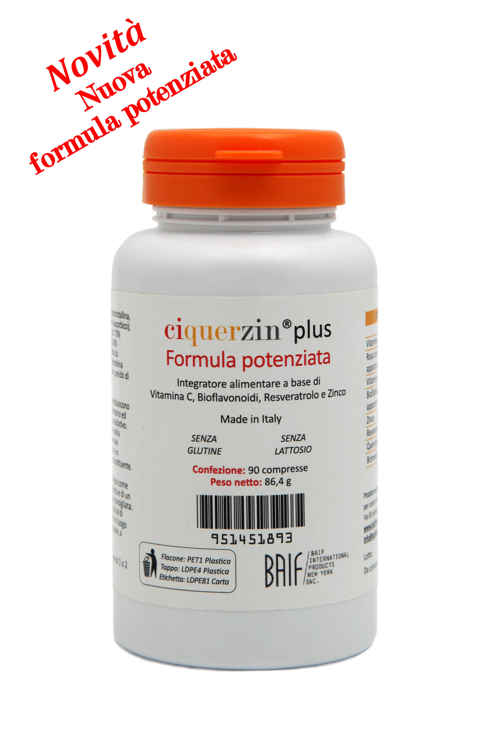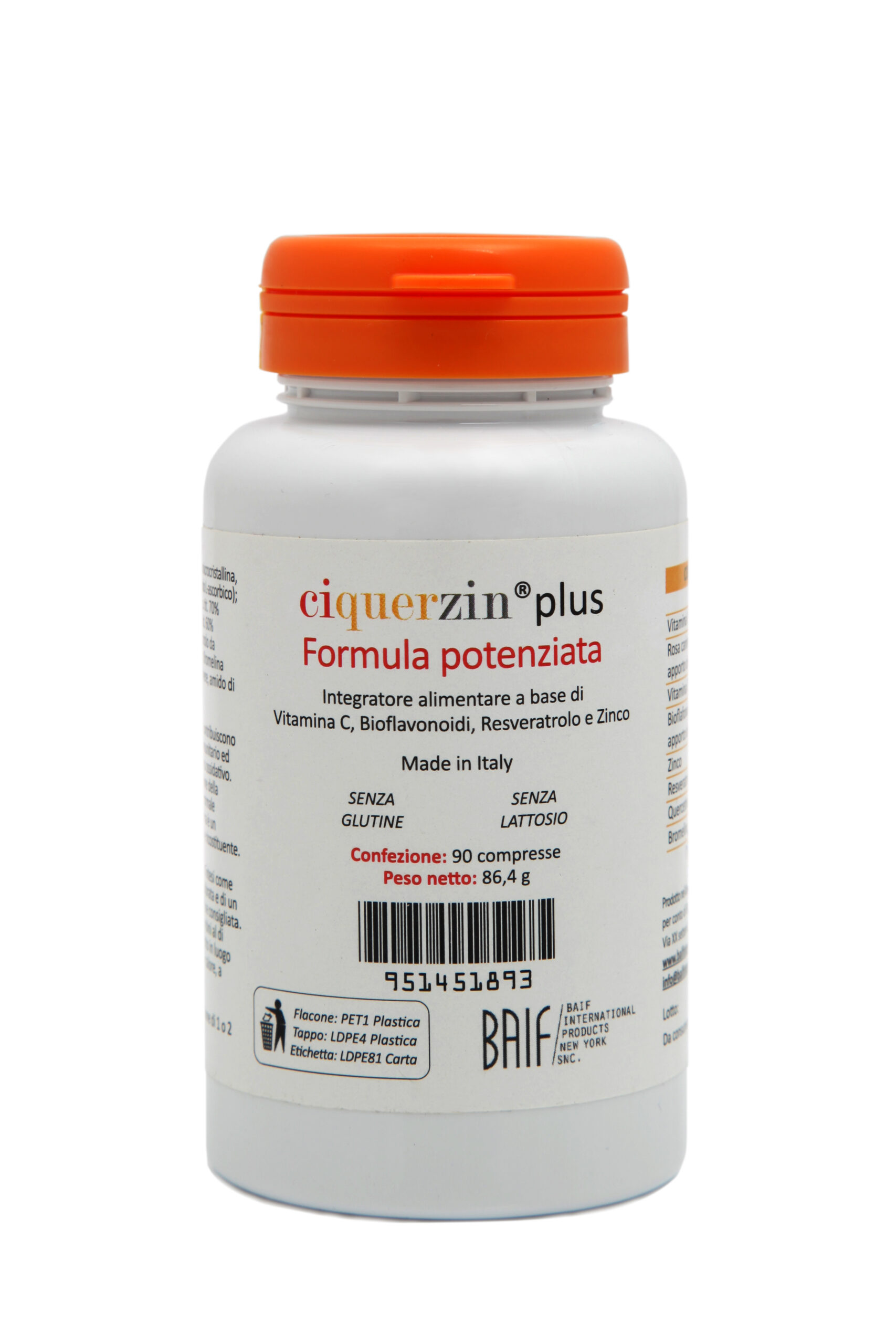 Ingredienti:Agenti di carica: cellulosa microcristallina, calcio fosfato tribasico; Vitamina C (acido L-ascorbico); Rosa canina (rosa canina L.) frutto e.s. tit. 70% vitamina C; Bioflavonoidi da agrumi tit. 60% esperidina; Zinco picolinato; Resveratrolo da polygonum cuspidatum; Quercetina; Bromelina 2400-2500 GDU/g; Agenti antiagglomeranti: latte di cocco polvere, amido di patata, gomma guar.